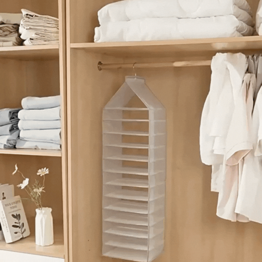 Meet your closet's new best friend for a neat, organized space. This 6-slot hanging organizer makes decluttering a seamless part of your day, keeping your clothes neatly arranged and easy to access. It's the ultimate solution for a quick, elegant fix that fits perfectly in your closet and into your busy schedule.